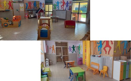 I nostri spazi – Scuola Don Venturi a I NOSTRI SPAZI La strutturazione dello spazio risponde alle esigenze dei bambini e delle loro famiglie. La nostra scuola dell’Infanzia è così disposta: ingresso con bacheca ampio corridoio attrezzato con armadietti per gli indumenti dei bambini vasto salone strutturato in angoli gioco spazio accoglienza strutturato con angolo morbido e angoli gioco dormitori, con finestre oscurabili tre sezioni, a cui si accede dal salone centrale, con propri servizi igienici funzionali sia alle pratiche igieniche dei bambini, sia ad ev entuali attività manipolative particolari; ogni sezione ha un accesso diretto al giardino ampio refettorio che accoglie le tre sezioni della Scuola dell’Infanzia palestra attrezzata per gioco motorio e psicomotricità spazio esterno: portico, area verde con alberi e prato, macrostrutture da gioco esterno cucina per la preparazione del p asto e merenda spazio per adulti: ufficio di segreteria e direzione, due bagni con antibagno, di cui uno adibito a spogliatoio del personale, dispensa, depositi per materiale pulizie e materiale didattico.a a La sezione Primavera: corridoio attrezzato con mobiletti per indumenti in comune con le altre sezioni un’ampia sezione diversificata nell’organizzazione dello spazio due spazi dedicati rispettivamente: refettorio e dormitorio il bagno e il giardino riservato, attrezzato con strutture adeguate all’età. Ecco alcune immagini degli spazi della Scuola Don Venturi: AAA AAA