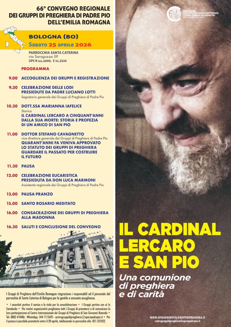 Come ogni anno, il 25 aprile la città di Bologna accoglierà per il 66° anno consecutivo i Gruppi di Preghiera di Padre Pio presso la Chiesa di Santa Caterina, dove i Gruppi incontreranno Don Luca Marmoni, loro Assistente Regionale.