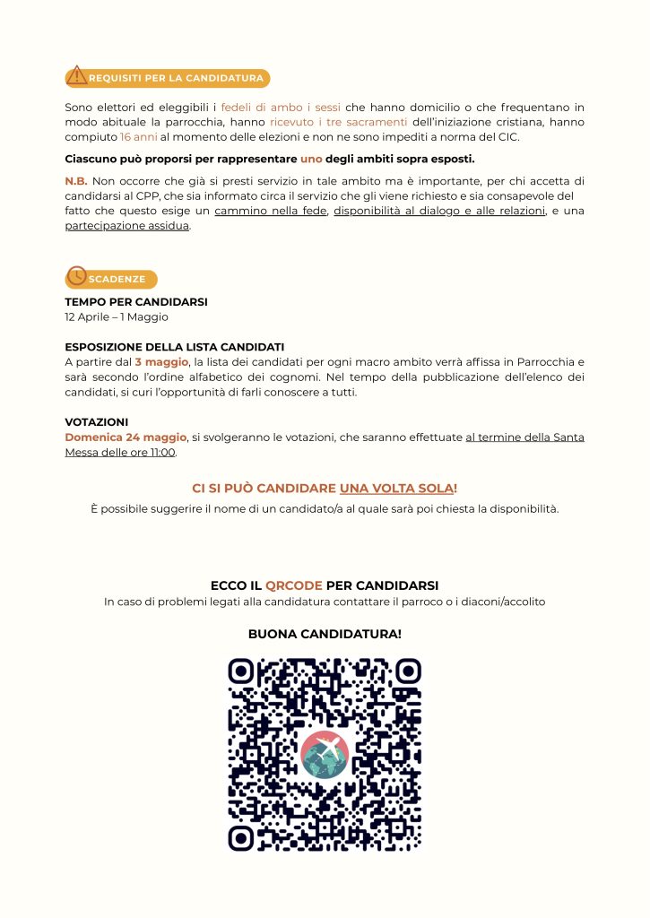 Avvisi Argelato 12 Aprile 2026 12/04 - 1/05 Candidarsi al CPP di Argelato ! Ecco anche il link: CLICCA QUI Tutte le info sul Consiglio Pastorale, lo Statuto, cos’è e come funziona le trovate qui sul sito, nella pagina dedicata ! (Clicca Qui)