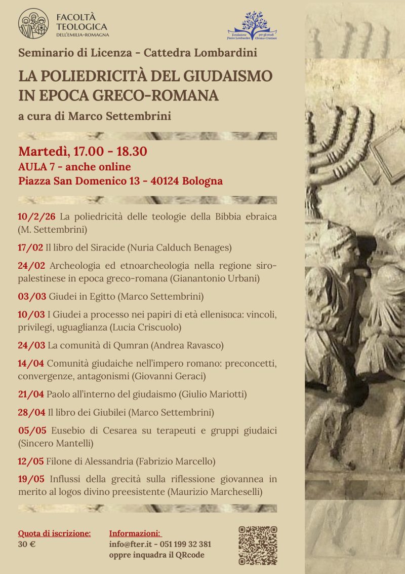 Nei mesi che vanno da febbraio e maggio 2026, il tema “giudaismo in epoca greco-romana” sarà oggetto di una serie di approfondimenti nell’ormai consueto ciclo seminariale di incontri denominato Cattedra Lombardini.