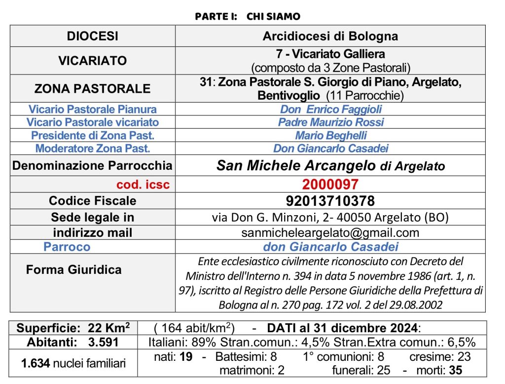 Proviamo insieme a volerci più Bene, a condividere di più e meglio questo nostro essere parrocchiani di San Michele Arcangelo, ad impegnarci maggiormente e in prima persona nella vita della nostra Parrocchia e dando vita, attraverso il servizio, a questa nostra realtà locale di Argelato, così da adempiere in pienezza e con gioia al Battesimo che abbiamo ricevuto ed essere “PIETRE VIVE” per edificare una CHIESA che PREGA, che ANNUNCIA e che AMA.
