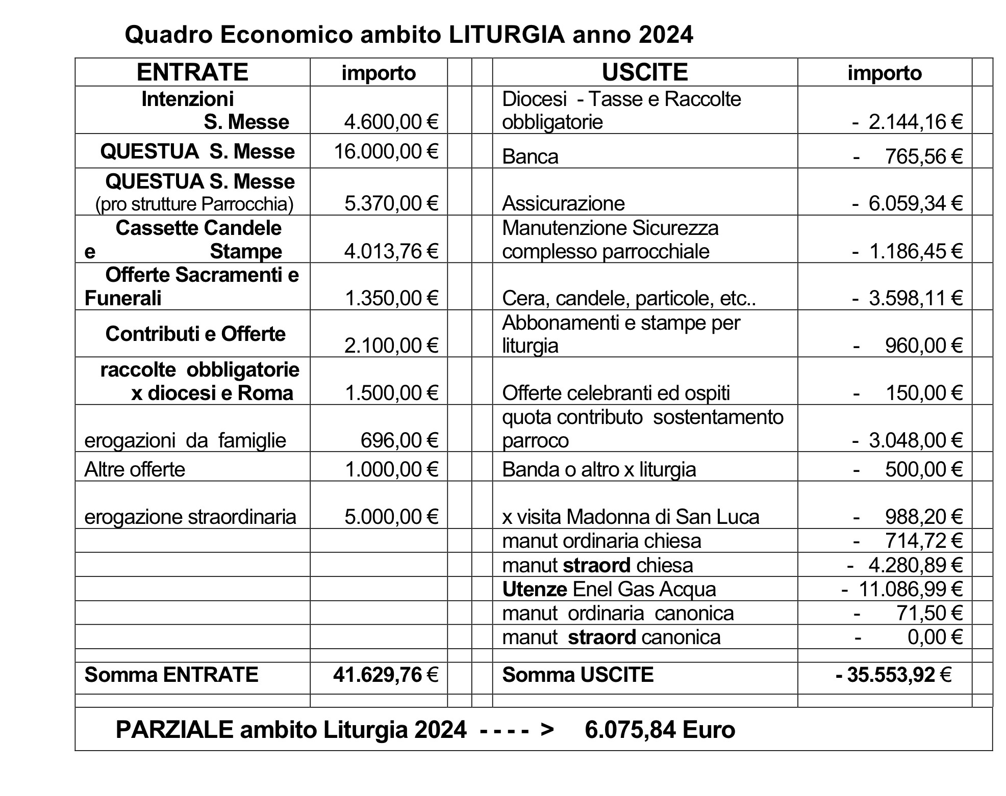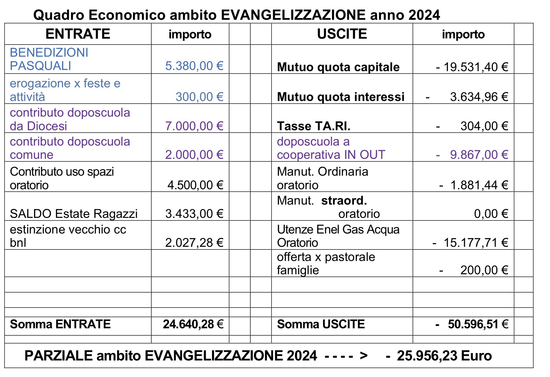 Per scelta, non facciamo qui un elenco (che sarebbe lungo almeno una pagina intera), ma tante e numerose sono le attività che possono essere avviate e/o necessiterebbero di essere avviate per conservare e accrescere questa nostra comunità parrocchiale, sia in termini di evangelizzazione, di carità e sia come strutture (ad esempio creare un servizio di Segreteria Parrocchiale), ma perché siano davvero efficaci occorre che siano pensate, strutturate, valutate, scelte e realizzate insieme e che possano contare su risorse sufficienti per poterle portare avanti.