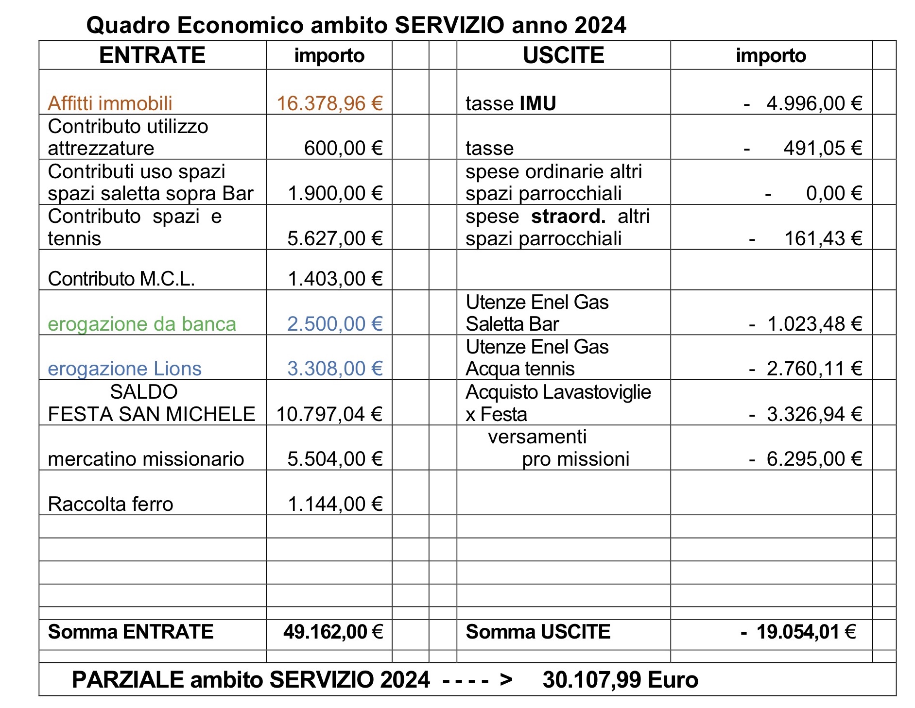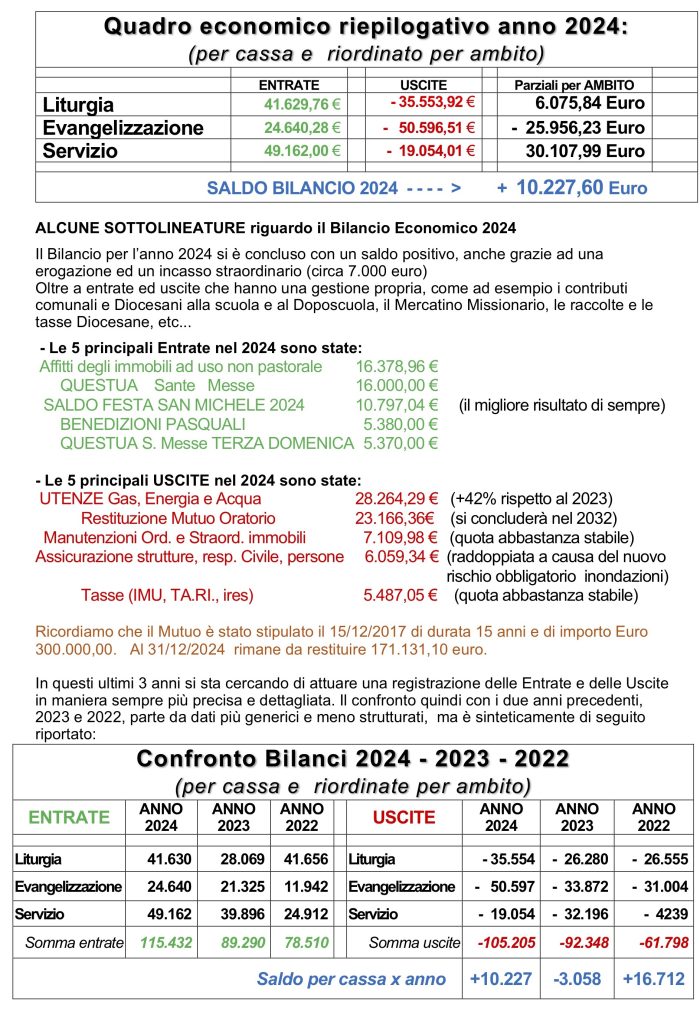 In questo 1° anno del presente documento non è stato riportato il risultato economico dell’Asilo Parrocchiale Don R.Venturi e il suo ruolo rilevante all’interno dell’intera realtà Parrocchiale, ma è sicuramente un’altra delle realtà peculiari e arricchenti della nostra Comunità.