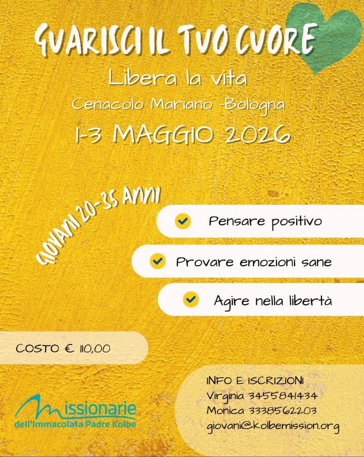 Avvisi Argelato 12 Aprile 2026 01-03/05 - Cenacolo Mariano (BO) Guarisci il tuo cuore Una proposta per i giovani, per un ponte del primo maggio alternativo!